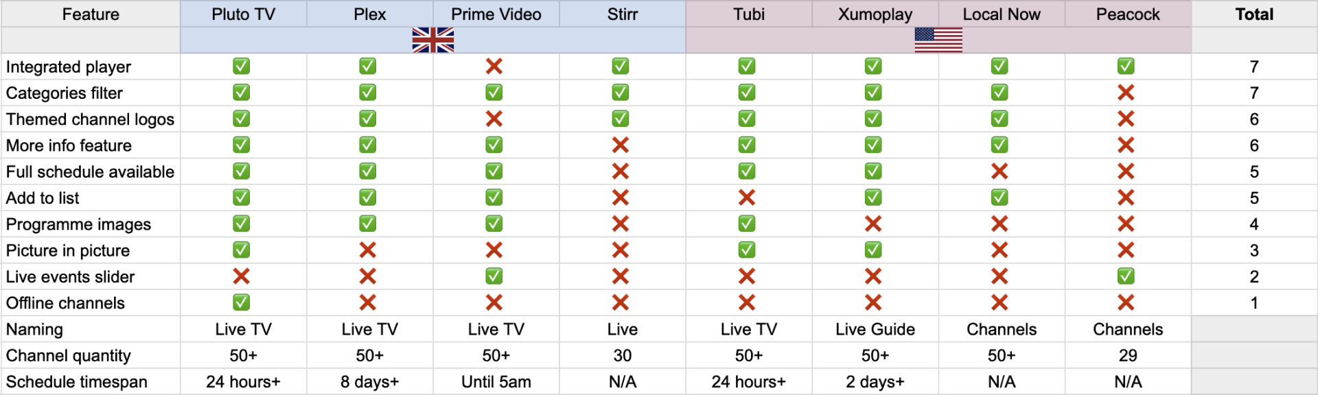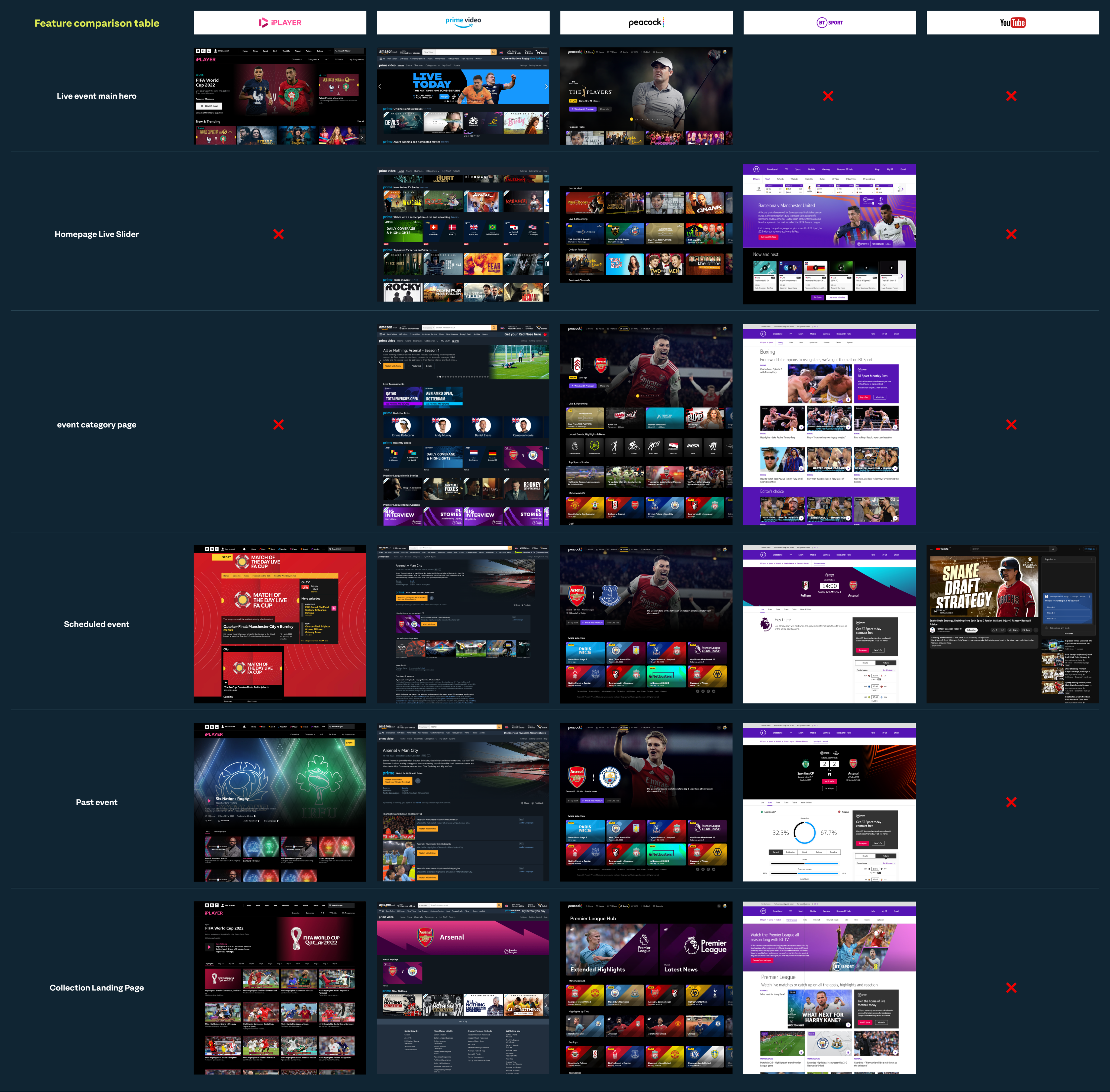 To better understand how live streaming experiences work across modern platforms, I reviewed several competitor products including BBC iPlayer, Prime Video and Pluto TV. This analysis focused on how different platforms handle channel browsing, programme discovery and live playback interactions.