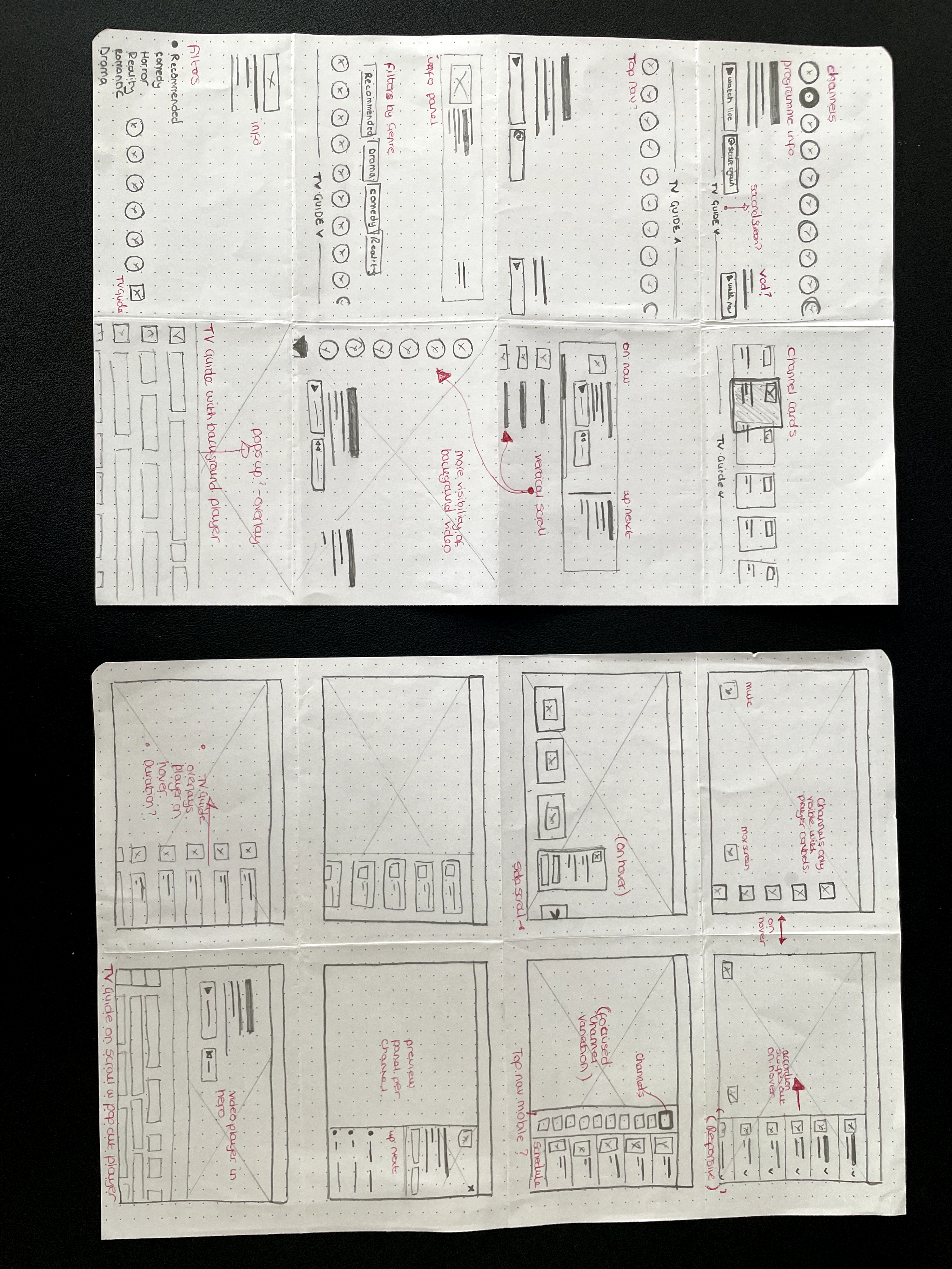 Alongside this research, I explored multiple interaction models through quick ideation exercises and low‑fidelity wireframes. The goal was to understand how browsing and playback could work together without interrupting the viewing experience.
